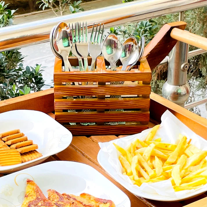 Rustic torched wood napkin holder dispenser caddy with dining utensil server organizer slots provides a stylish way to keep meal time essentials easily accessible in your home kitchen, dining room, café, bar, or restaurant